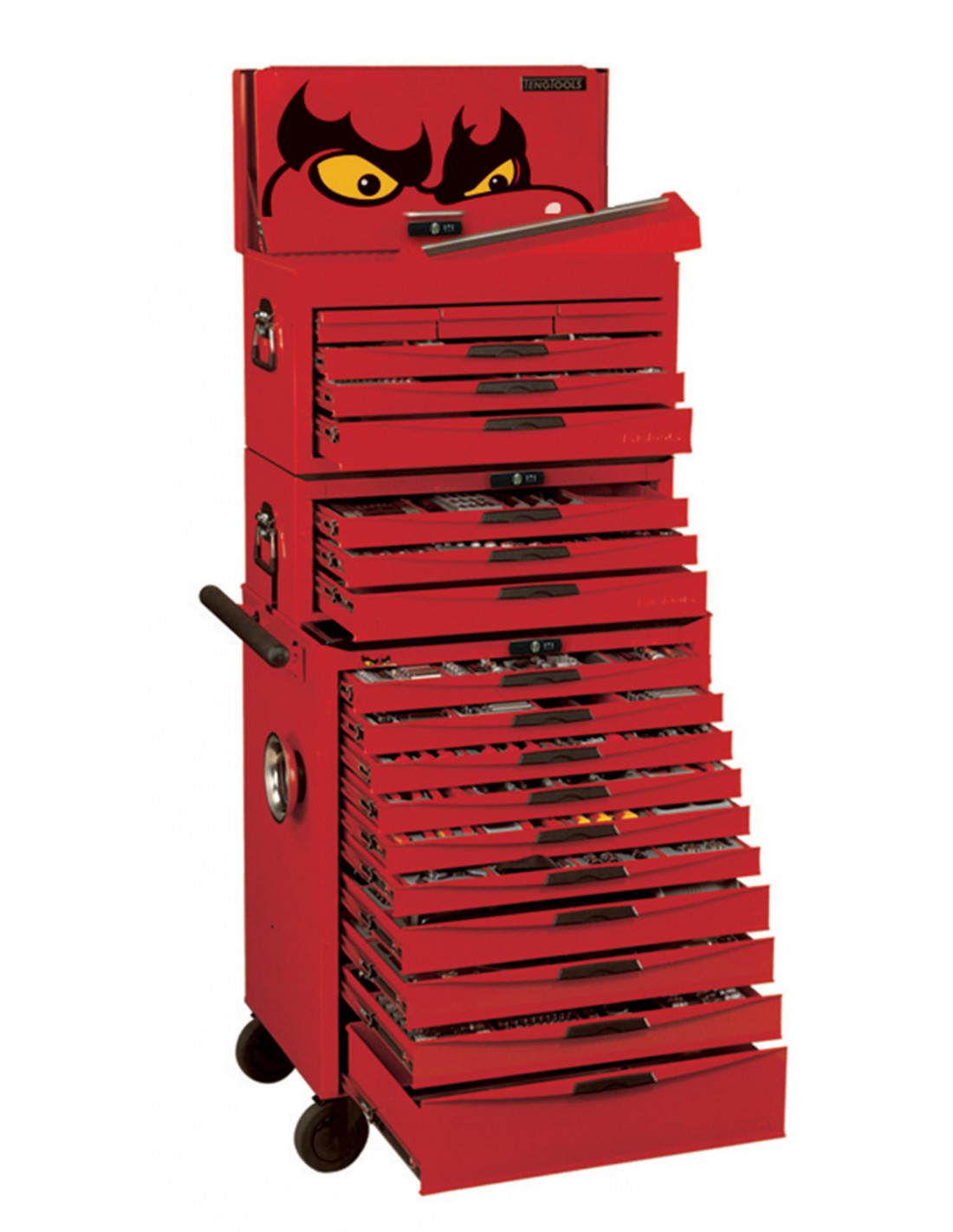 Zestaw narzędzi 1001-elementowy. Umieszczony w skrzynkach narzędziowych TC803N, TC806NF i wózku narzędziowym TCW810N.W załączeniu łącznik stalowy TCF01 wiążący skrzynkę narzędziową pośrednią z wózkiem narzędziowym.